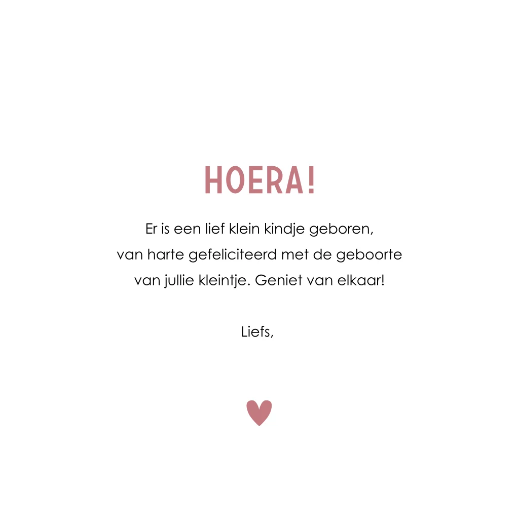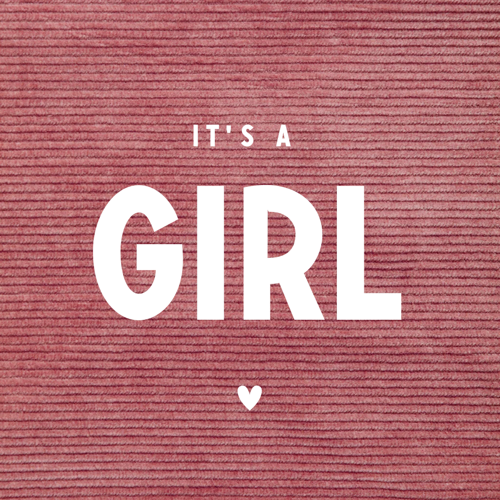 Super hippe wenskaart voor de geboorte van een dochter. Het design is opgebouwd uit een ribstof achtergrond met rosefolie letters.