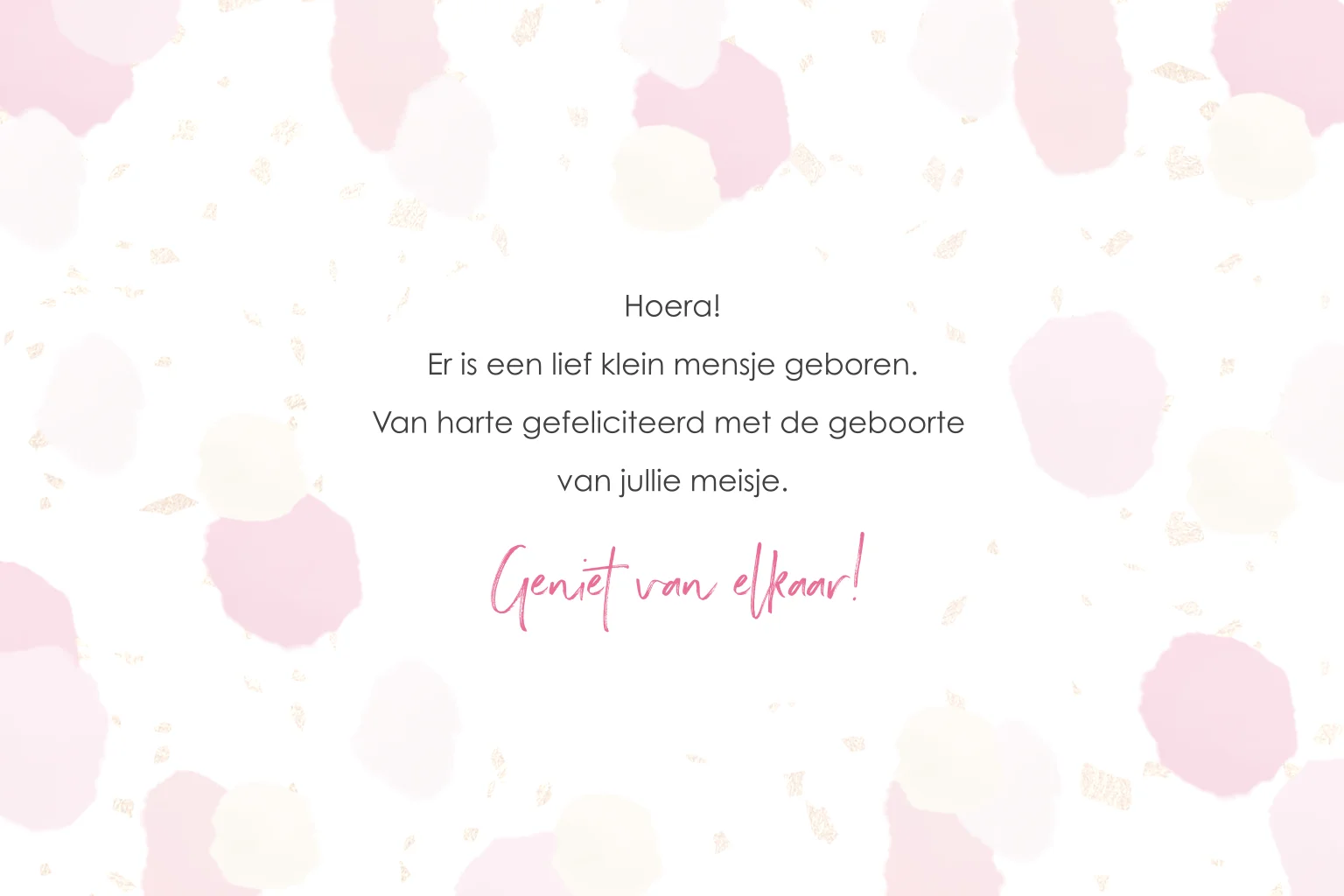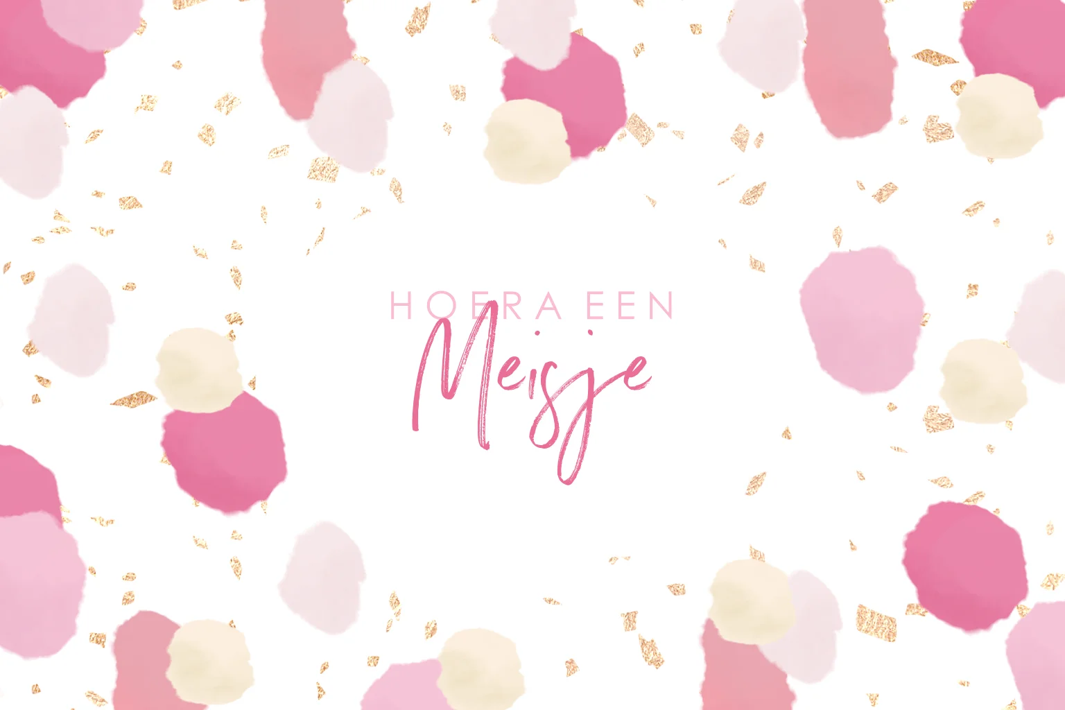 Hoera een meisje geboren! Kies voor deze vrolijke wenskaart met confetti in roze en goud.