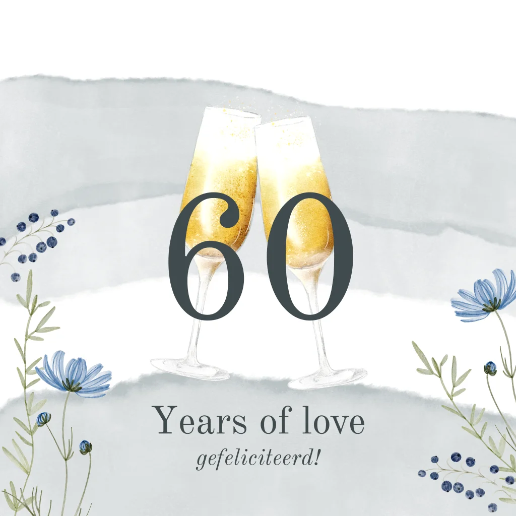 Stijlvolle wenskaart met bloemen en champagne om een stel te feliciteren met hun huwelijksjubileum.