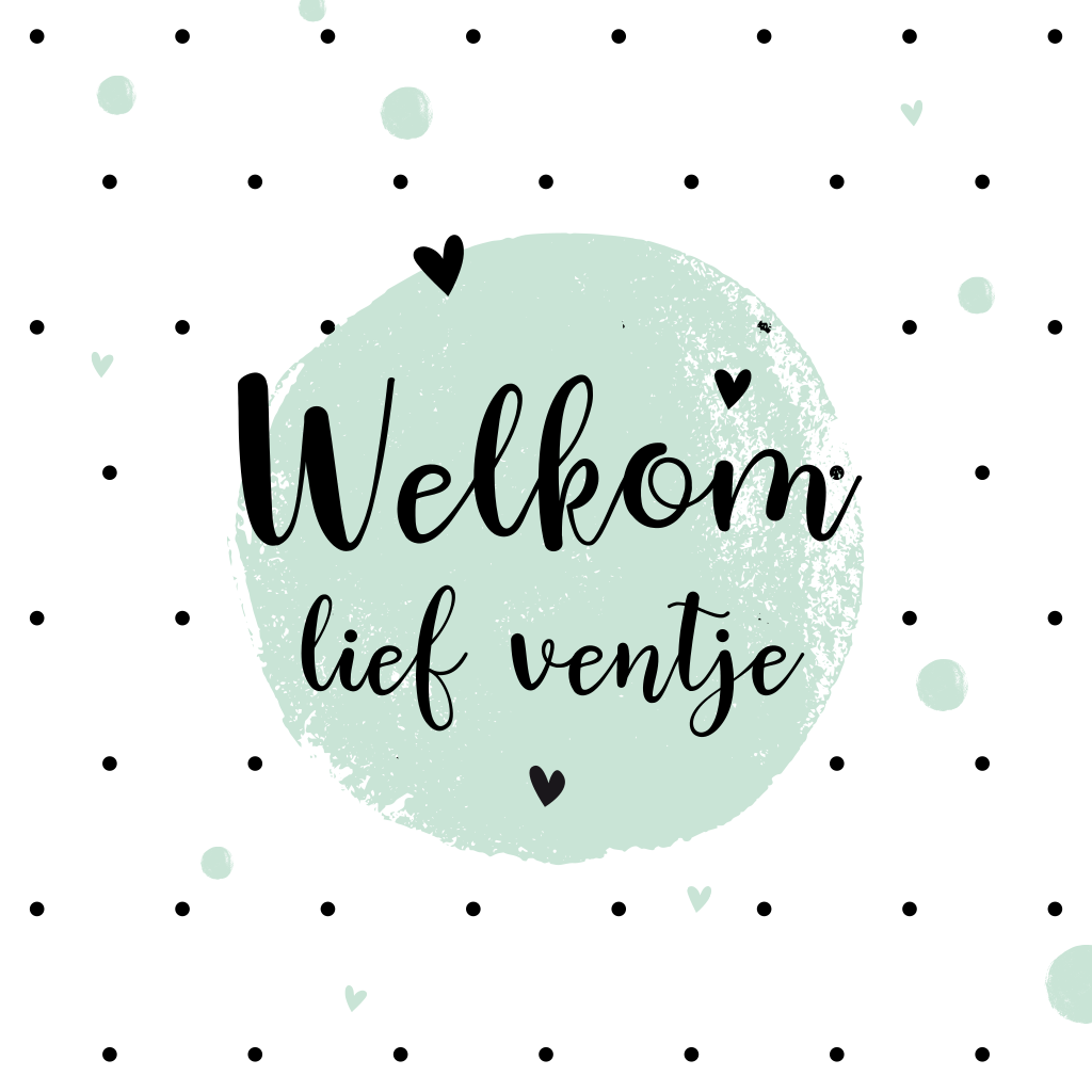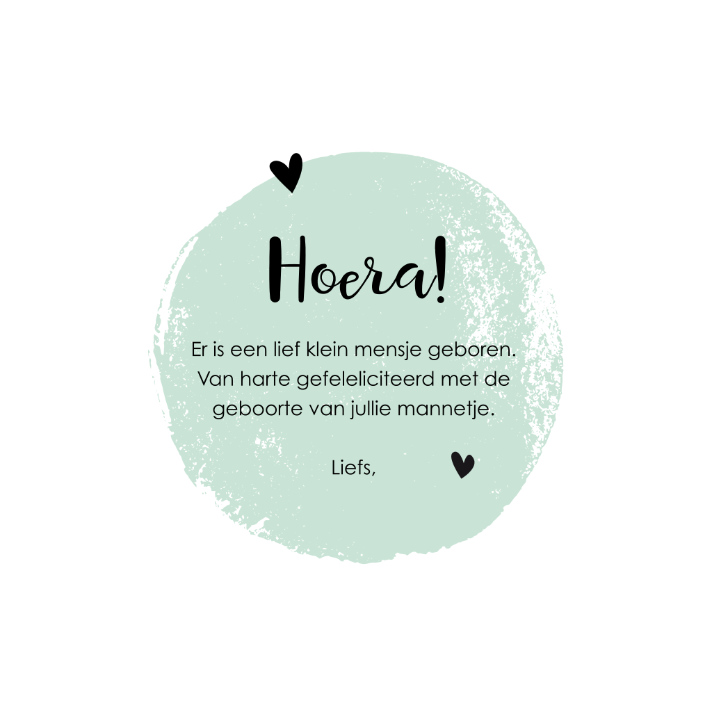 Een lief kaartje voor de geboorte van een zoon in zwart wit met groen, kleine stipjes en hartjes.