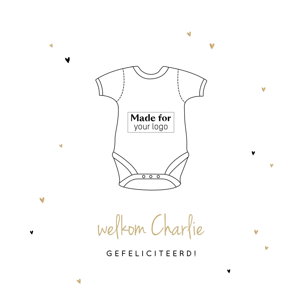 Je personaliseert deze kaart met de naam van de baby en jullie eigen logo op de voorzijde.