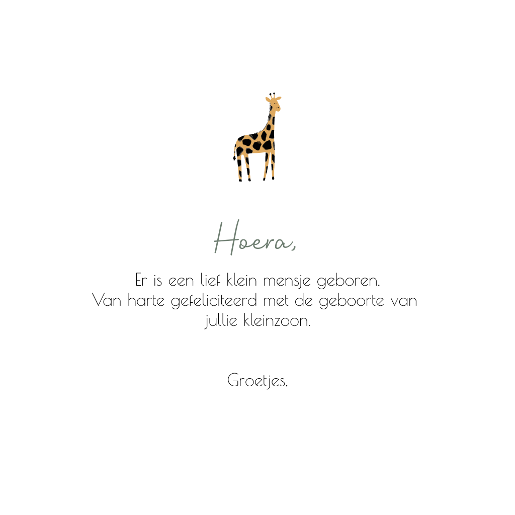 Hoera een kleinzoon! Deze schattige en lieve wenskaart met giraf illustratie is ideaal om te sturen en de nieuwe opa en oma te feliciteren met hun pasgeboren kleinzoon.