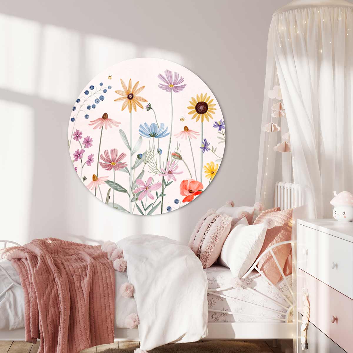 Muurcirkel met veldbloemen in vrolijke kleuren