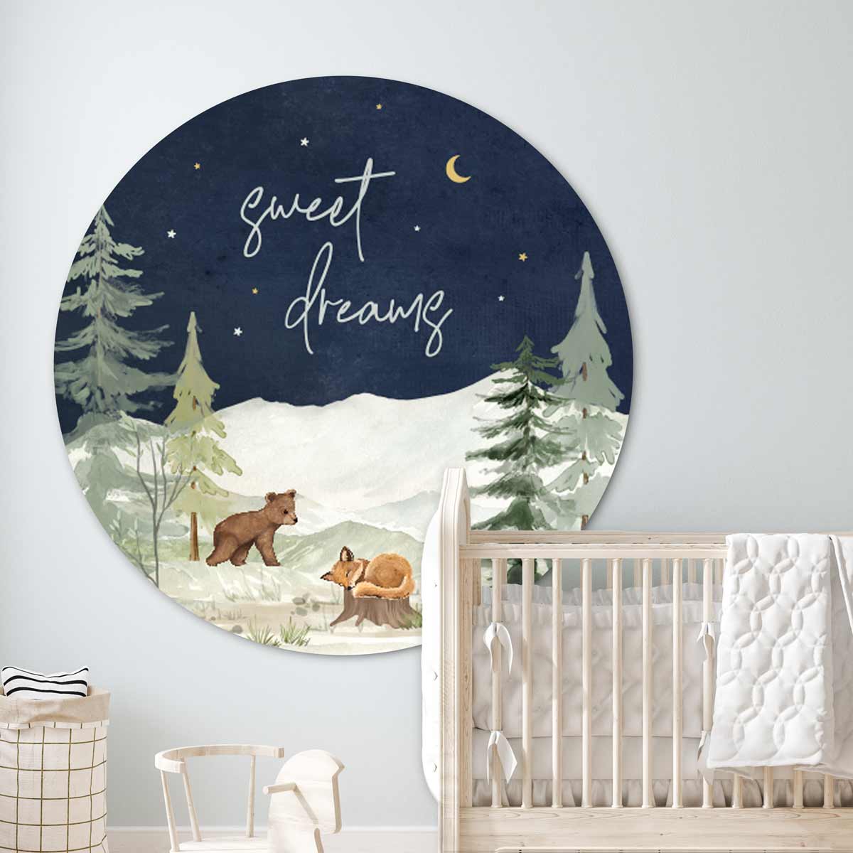 Een dromerig landschap op deze muurcirkel voor de babykamer. Onder de sterrenhemel een beer en een slapend vosje tussen de dennenbomen, sweat dreams!