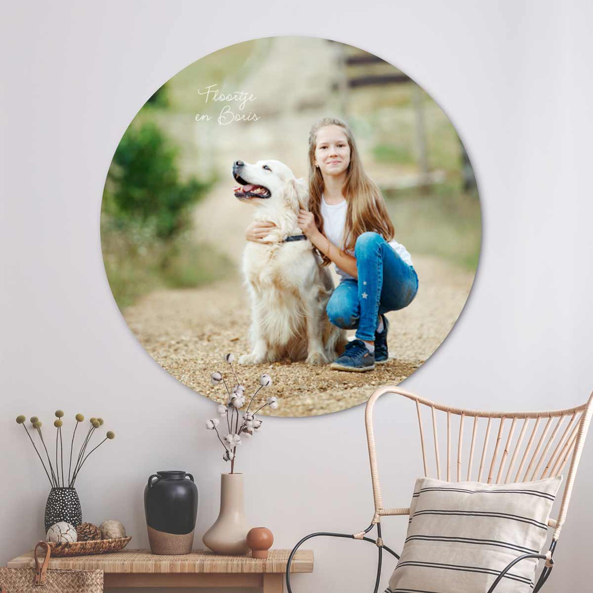Ontwerp een unieke muurcirkel met persoonlijke foto, zoals deze met jullie kind en huisdier. Zo maak je een kamer helemaal af! Bewerk het design gemakkelijk in onze editor, op een formaat en materiaal naar keuze.