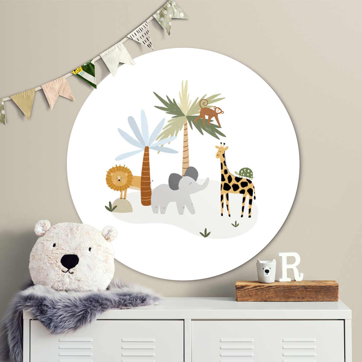 Vrolijk, dit muurcirkel design met jungledieren! Het aapje kijkt vanuit een palmboom naar de leeuw, olifant en giraffe, een kleurrijk tafereel!