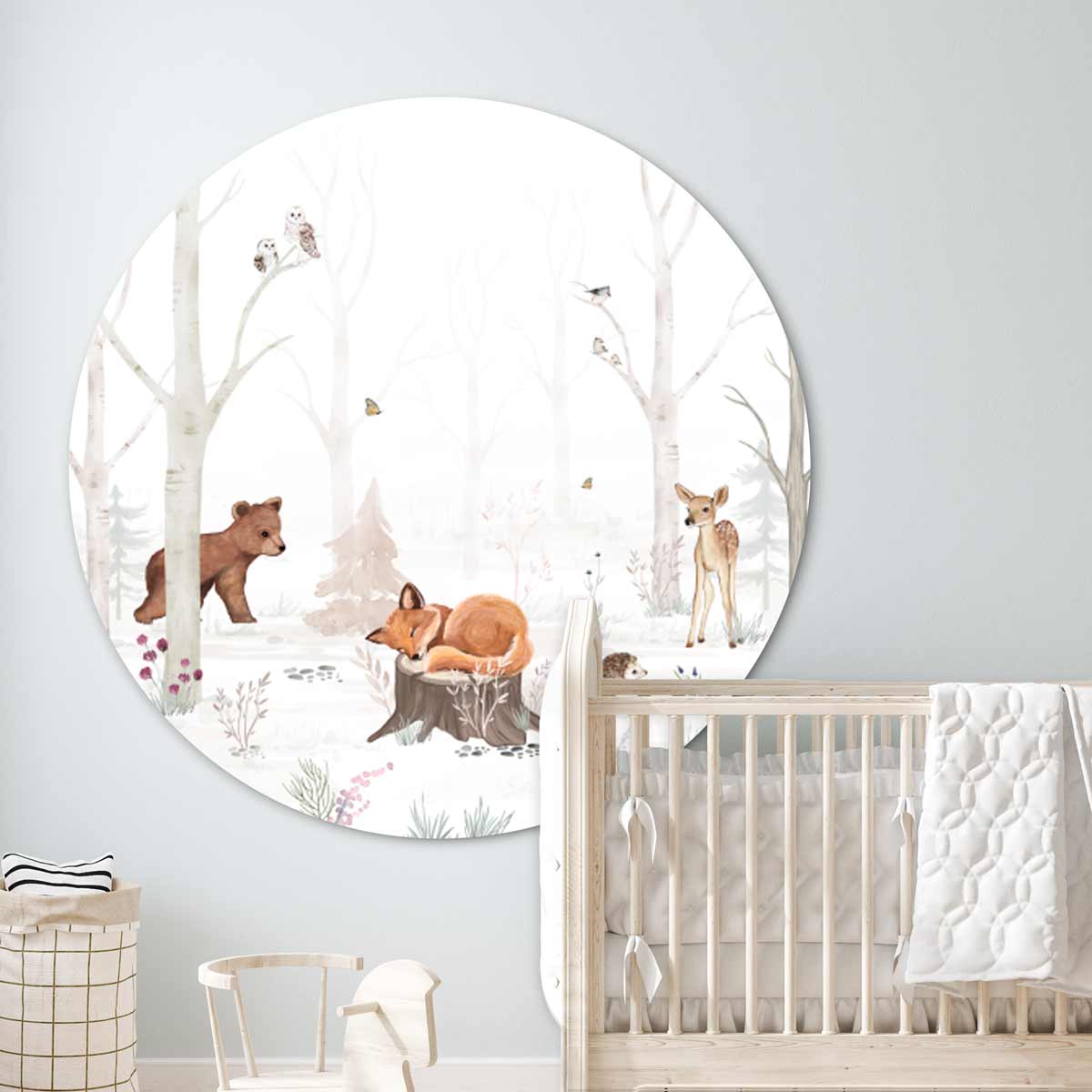 Vrolijk design, deze muurcirkel met een winters dierenbos! Alle dieren in het bos kijken naar het lieve vosje, dat heerlijk ligt te slapen op een boomstam.