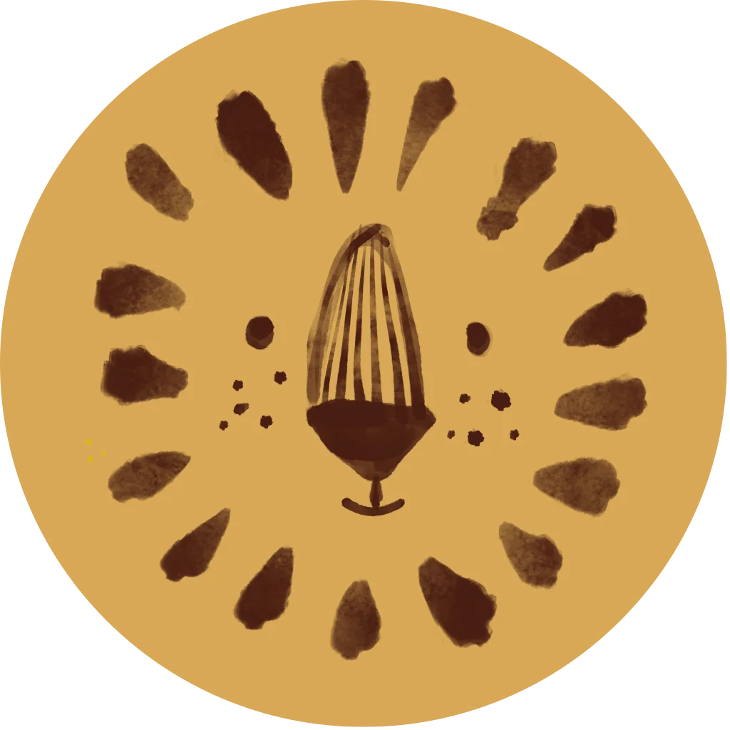 Goudgele muurcirkel voor de babykamer. Met losse bruine streken is een wiegje geschilderd met een krans van vlekjes eromheen.