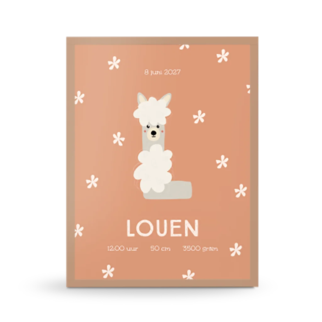 De initiaal van jouw kleintje in de hoofdrol op een geboorteposter, zó lief! Iedere letter is geïllustreerd in de vorm een diertje, met dezelfde beginletter. Deze poster heeft de L van Lama. Bewerk gemakkelijk de geboortegegevens in de editor en maak een persoonlijke poster voor je kleintje.