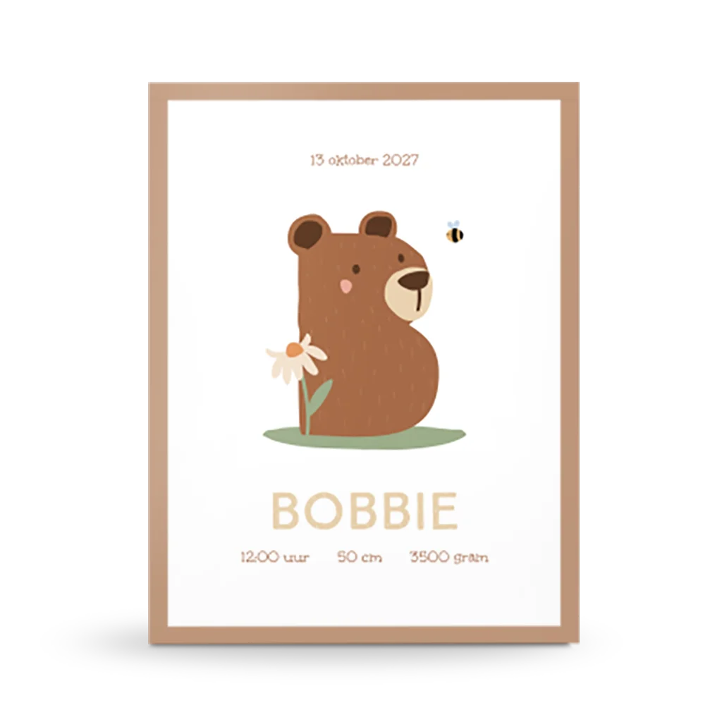 De initiaal van jouw kleintje in de hoofdrol op een geboorteposter, zó lief! Iedere letter is geïllustreerd in de vorm een diertje, met dezelfde beginletter. Deze poster heeft de B van Beer. Bewerk gemakkelijk de geboortegegevens in de editor en maak een persoonlijke poster voor je kleintje.