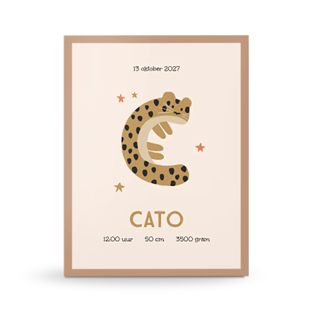 De initiaal van jouw kleintje in de hoofdrol op een geboorteposter, zó lief! Iedere letter is geïllustreerd in de vorm een diertje, met dezelfde beginletter. Deze poster heeft de C van Cheetah. Bewerk gemakkelijk de geboortegegevens in de editor en maak een persoonlijke poster voor je kleintje.