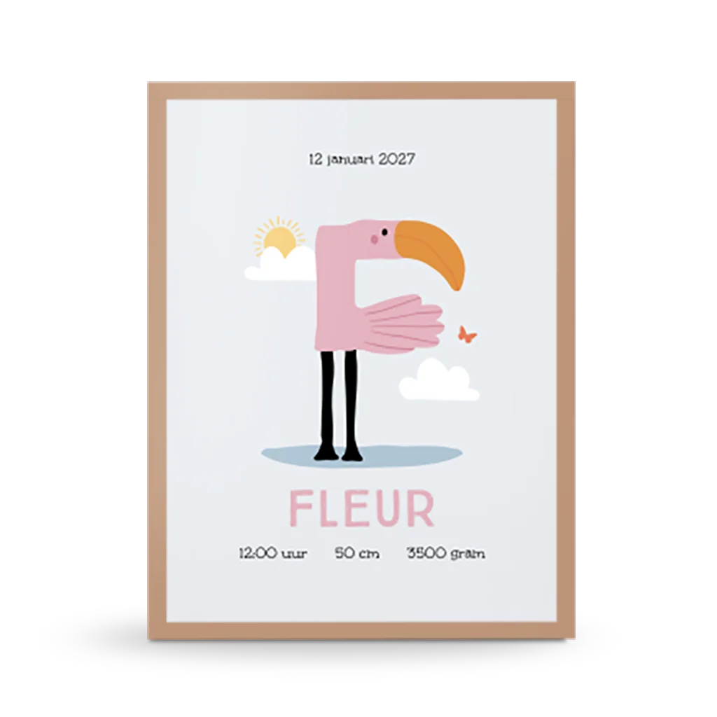 De initiaal van jouw kleintje in de hoofdrol op een geboorteposter, zó lief! Iedere letter is geïllustreerd in de vorm een diertje, met dezelfde beginletter. Deze poster heeft de F van Flamingo. Bewerk gemakkelijk de geboortegegevens in de editor en maak een persoonlijke poster voor je kleintje.