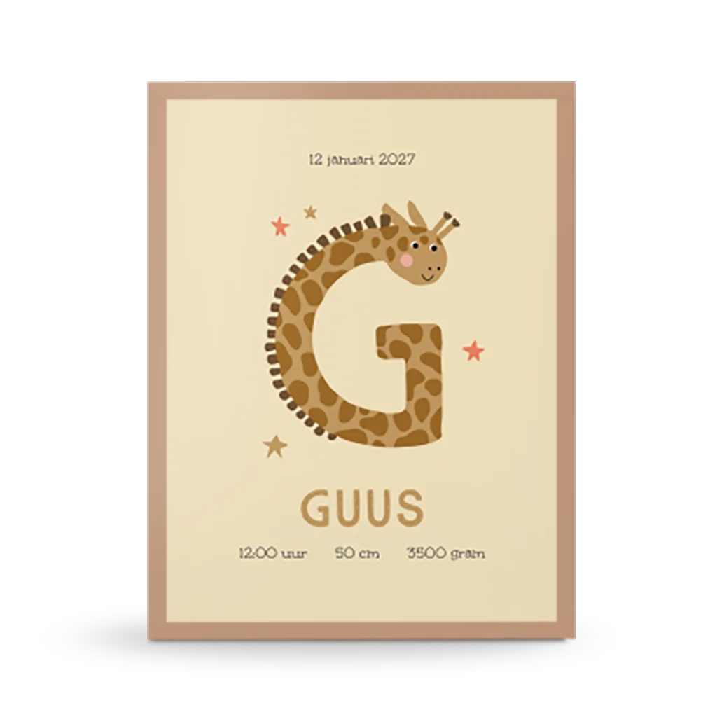 De initiaal van jouw kleintje in de hoofdrol op een geboorteposter, zó lief! Iedere letter is geïllustreerd in de vorm een diertje, met dezelfde beginletter. Deze poster heeft de G van Giraf. Bewerk gemakkelijk de geboortegegevens in de editor en maak een persoonlijke poster voor je kleintje.
