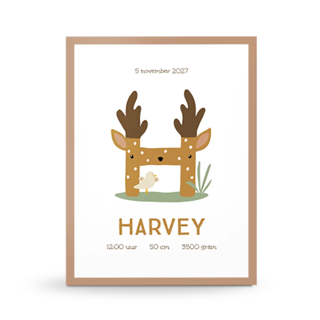 De initiaal van jouw kleintje in de hoofdrol op een geboorteposter, zó lief! Iedere letter is geïllustreerd in de vorm een diertje, met dezelfde beginletter. Deze poster heeft de H van Hert. Bewerk gemakkelijk de geboortegegevens in de editor en maak een persoonlijke poster voor je kleintje.