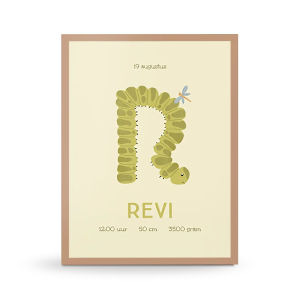 De initiaal van jouw kleintje in de hoofdrol op een geboorteposter, zó lief! Iedere letter is geïllustreerd in de vorm een diertje, met dezelfde beginletter. Deze poster heeft de R van Rups. Bewerk gemakkelijk de geboortegegevens in de editor en maak een persoonlijke poster voor je kleintje.