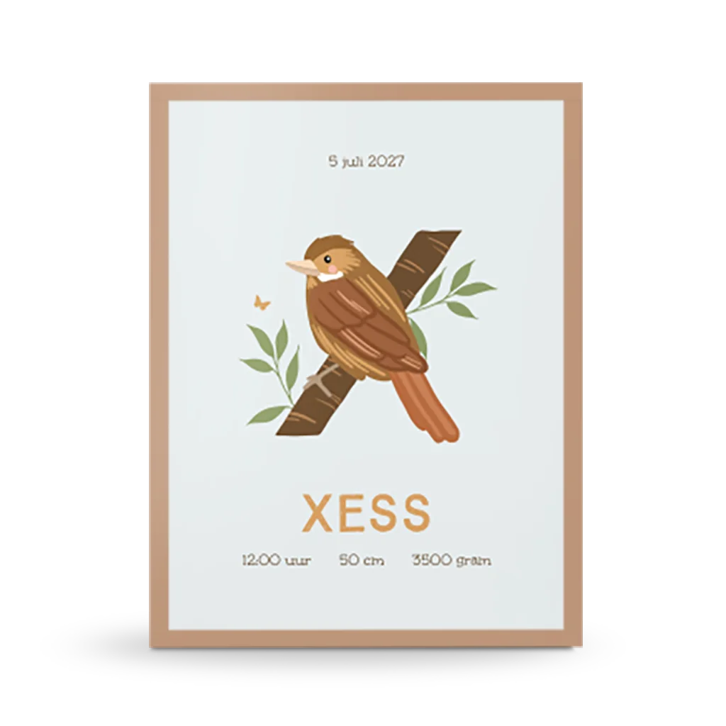 De initiaal van jouw kleintje in de hoofdrol op een geboorteposter, zó lief! Iedere letter is geïllustreerd in de vorm een diertje, met dezelfde beginletter. Deze poster heeft de X van Xenops. Bewerk gemakkelijk de geboortegegevens in de editor en maak een persoonlijke poster voor je kleintje.