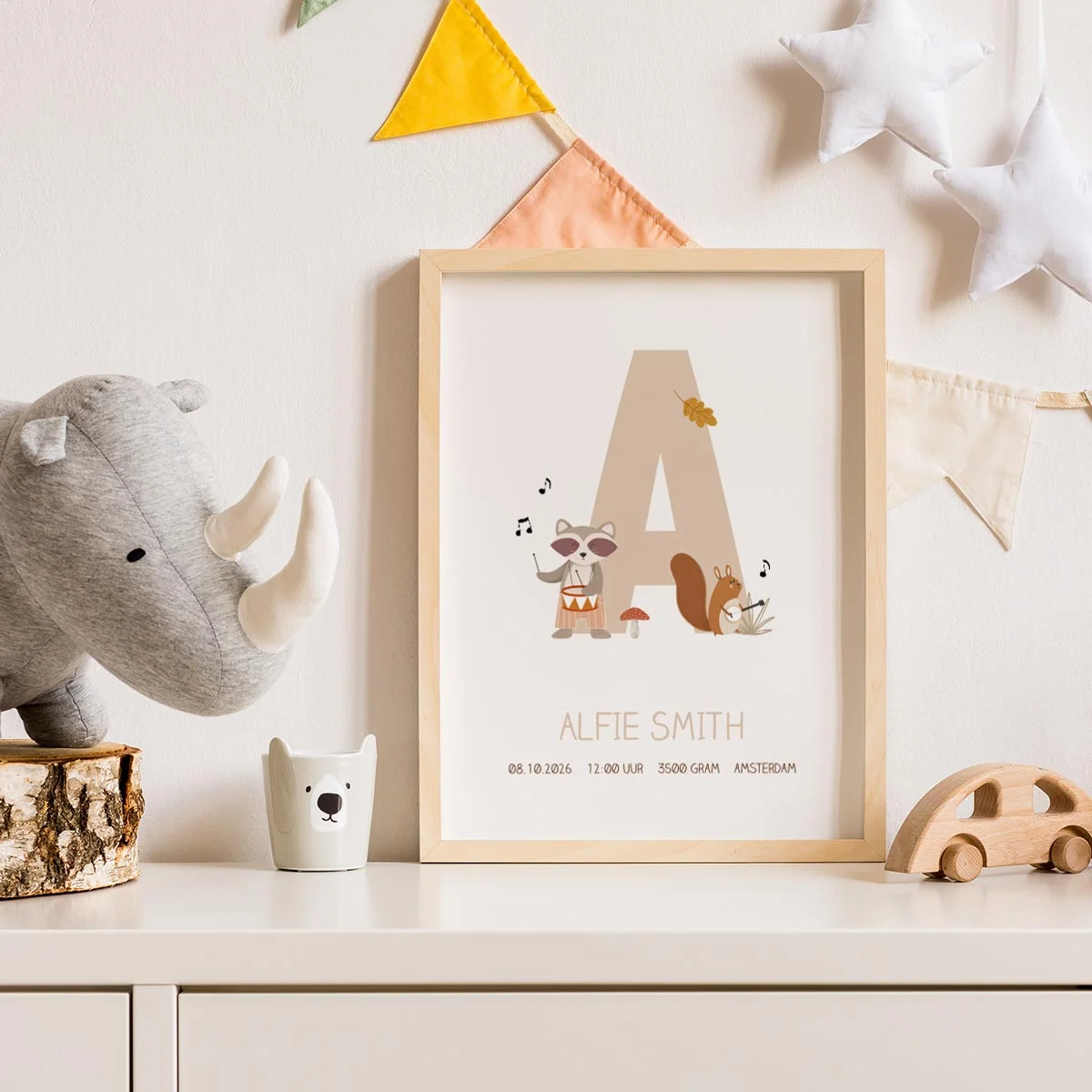 Deze poster voor op de kinderkamer van jullie kindje heeft lieve diertjes die muziek maken. Ook het initiaal van jullie kleintje staat hierop. Ontzettend makkelijk zelf aan te passen. Hulp nodig met aanpassen? We helpen graag!
