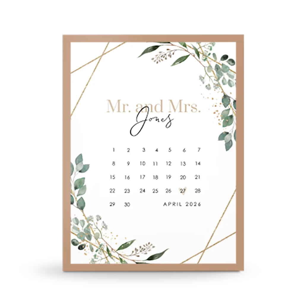 Huwelijksposter met trouwdatum kalender in botanische stijl met goud