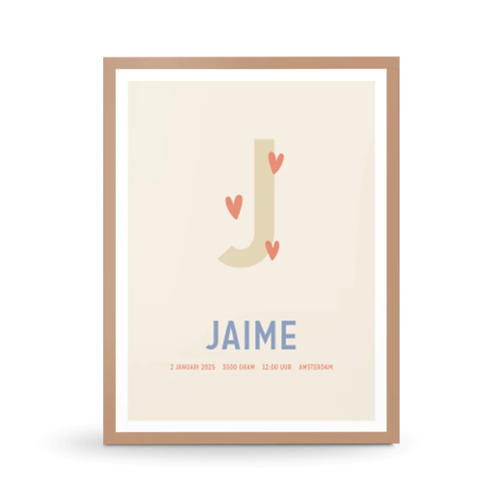 Op deze poster, die je in de babykamer kunt ophangen, zijn de geboortegegevens en het initiaal van jullie kindje te zien. Pas de elementen gemakkelijk aan in de editor. Hulp nodig met aanpassen? We helpen graag!
