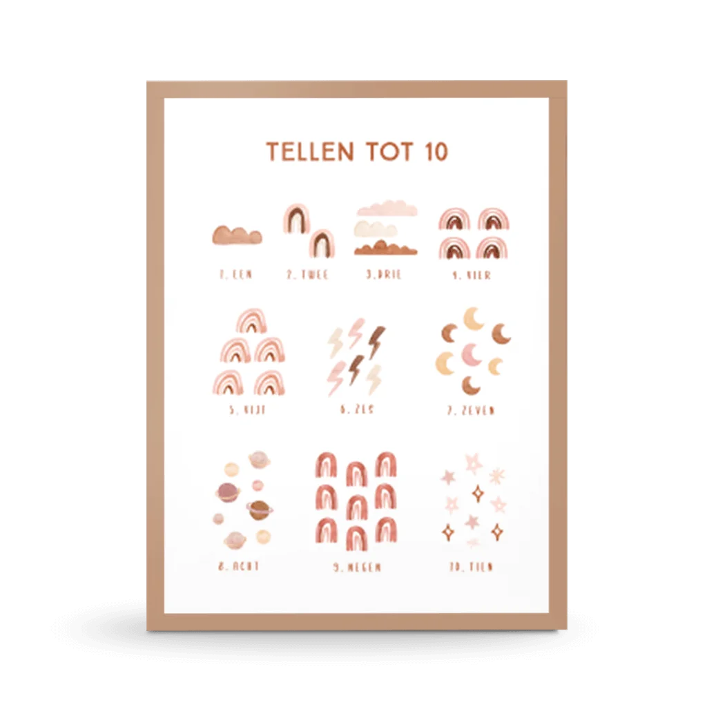 Hoe leuk is dat, leren tellen met deze superlieve poster voor een meisje in roze en bruin! Met wolk, regenboog, maan, sterren en planeten tel je tot tien. Kies voor dit ontwerp en bewerk gemakkelijk alle elementen.