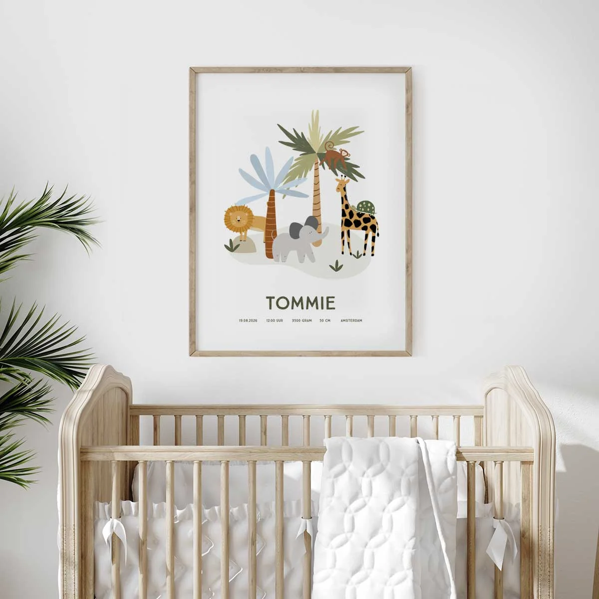 Deze poster voor op de kinderkamer van jullie kleintje heeft een prachtige illustratie van verschillende jungledieren. Hulp nodig met aanpassen? We helpen graag!