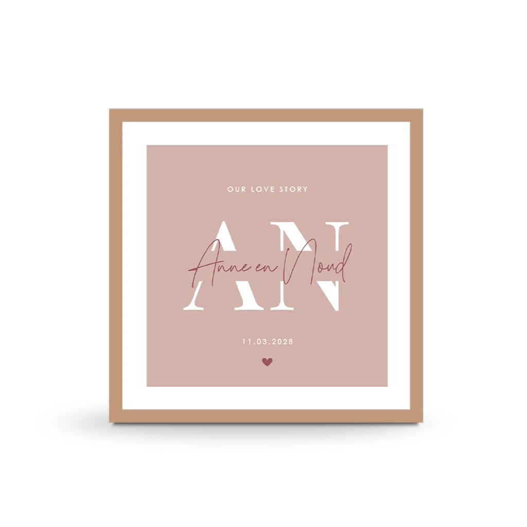 Stijlvolle vierkante poster in hetzelfde design als de trouwkaart, trendy! De namen en initialen in wit en donkerrood staan op een oudroze achtergrond met witte rand. Kies voor dit ontwerp en bewerk gemakkelijk alle elementen.