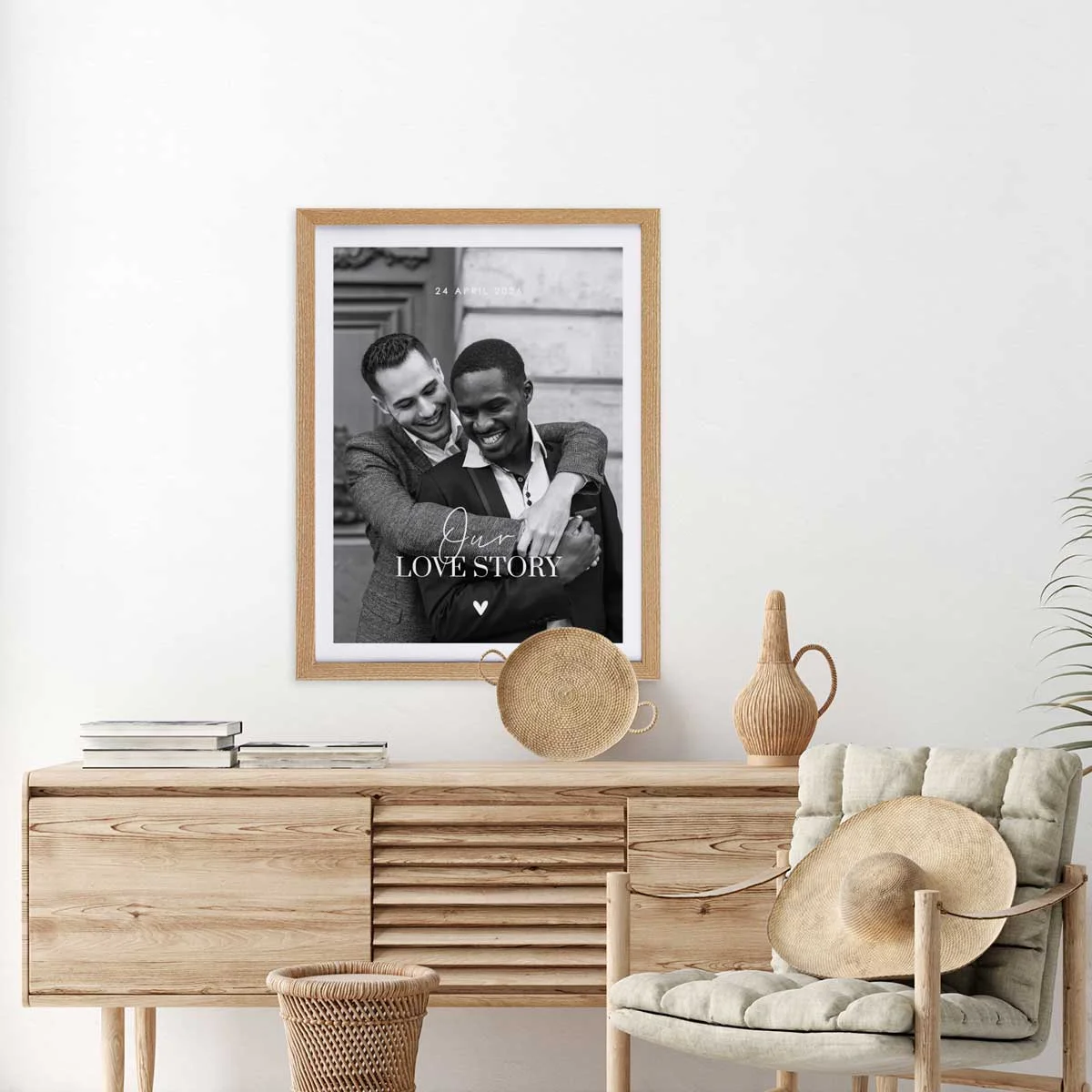 Een mooie herinnering aan de bruiloft, deze zwartwit trouwposter met foto! Om de foto een witte rand en ook de tekst 'Love Story' en het hartje zijn wit. Kies voor dit ontwerp en bewerk gemakkelijk alle elementen.