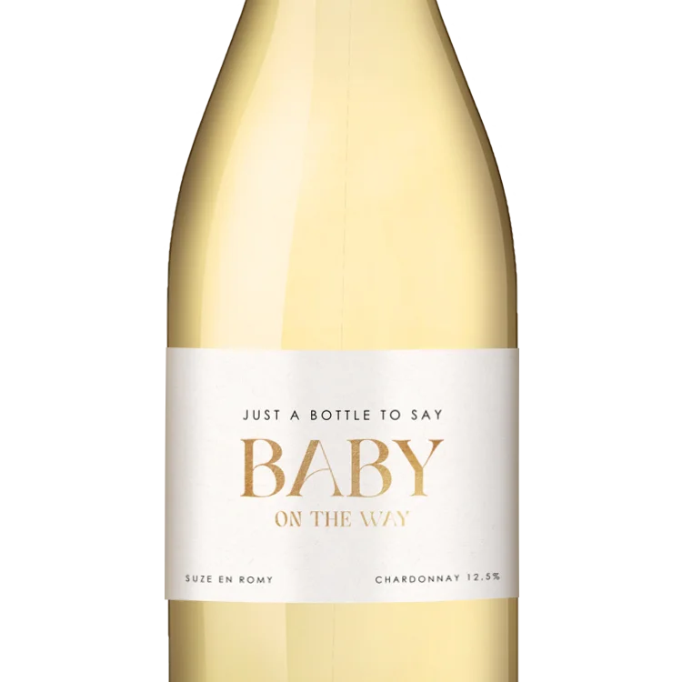 Oh, wat worden wij blij van deze zwangerschapsaankondiging! Plak het wijnetiket op je favoriete fles (alcoholvrije) wijn en verras vrienden en familie met het babynieuws. Pas dit etiket gemakkelijk aan naar jullie smaak in de editor. Voeg eventueel tekst en andere elementen - ook in goudfolie - toe. Zo maak je het wijnetiket helemaal eigen.| 21 × 30 cm | vanaf 4,50 p/st |