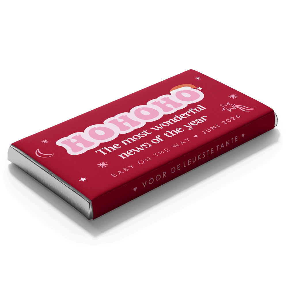 Ho ho ho, jij hebt dit jaar wel een heel bijzonder kerstcadeau! Verras een tante to be met deze vrolijke chocoladereep met eigen wikkel in kerstsfeer.