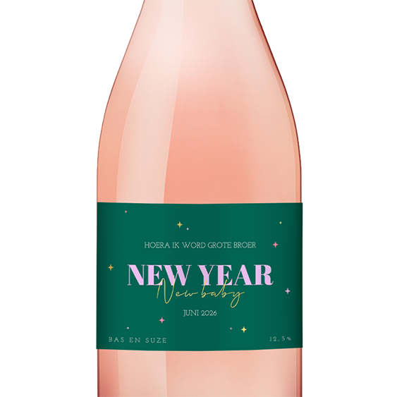 New year, new baby! Een originele zwangerschapsaankondiging voor aan de kersttafel in de vorm van een etiket voor op een wijnfles. Pas dit etiket gemakkelijk aan naar jullie smaak in de editor. Voeg eventueel tekst en andere elementen - ook in goudfolie - toe. Zo maak je het wijnetiket helemaal eigen.