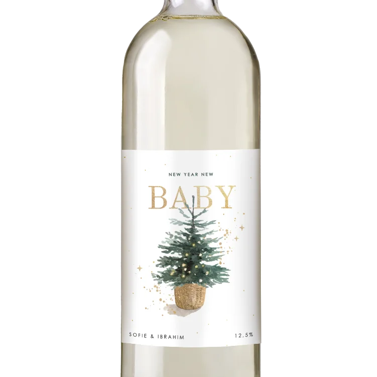 Een originele zwangerschapsaankondiging voor aan de kersttafel in de vorm van een etiket voor op een wijnfles. Pas dit etiket gemakkelijk aan naar jullie smaak in de editor. Voeg eventueel tekst en andere elementen - ook in goudfolie - toe. Zo maak je het wijnetiket helemaal eigen.