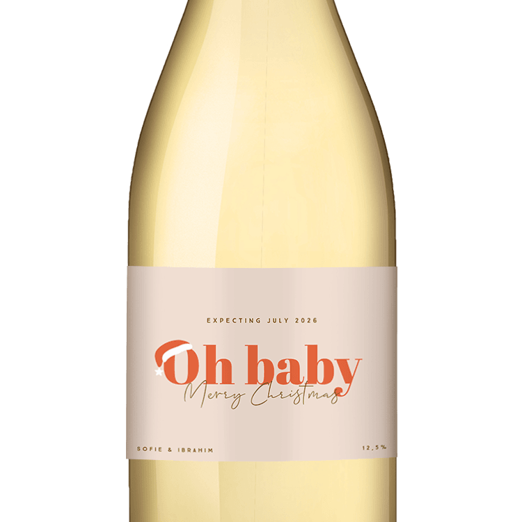 Oh baby, merry christmas! Een originele zwangerschapsaankondiging voor aan de kersttafel in de vorm van een etiket voor op een wijnfles. Pas dit etiket gemakkelijk aan naar jullie smaak in de editor. Voeg eventueel tekst en andere elementen - ook in goudfolie - toe. Zo maak je het wijnetiket helemaal eigen.