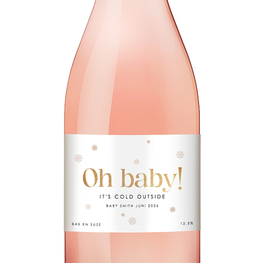 Een originele zwangerschapsaankondiging voor aan de kersttafel in de vorm van een etiket voor op een wijnfles. Pas dit etiket gemakkelijk aan naar jullie smaak in de editor. Voeg eventueel tekst en andere elementen - ook in goudfolie - toe. Zo maak je het wijnetiket helemaal eigen.